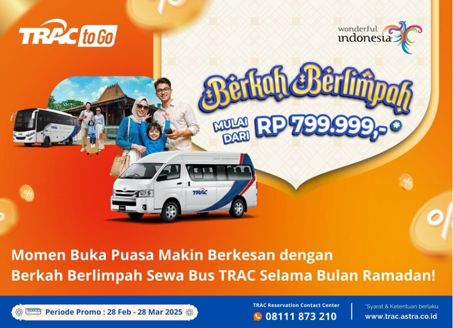 Selama bulan Ramadan, harga sewa bus pariwisata TRAC lebih hemat. Promo berlaku buat tipe Hiace, Medium Bus, serta Big Bus. Pesan sebelum 28 Maret 2025 lewat whatsapp reservasi TRAC 0811-1873-210